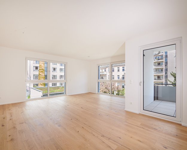 Die Gartenwohnungen verfügen über breite zweiflügelige Stulp-Terrassenelemente mit barrierearmen Schwellen. Durch den Verzicht auf einen festen Mittelpfosten entsteht eine maximale Öffnungsbreite – ideal für den Übergang zur Terrasse und den privaten Garten.