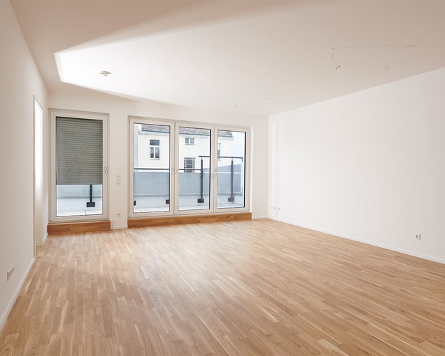 Das Penthouse verfügt über großflächige Terrassentüren zu den umlaufenden Dachterrassen.
