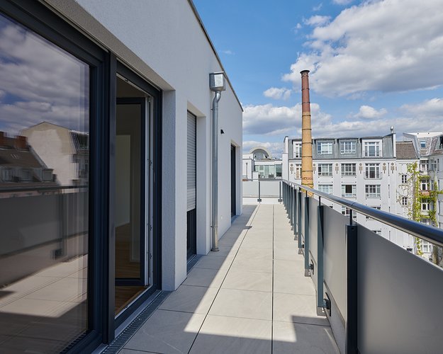 Für das fünfgeschossige Wohngebäude wurden insgesamt 52 Fensterelemente, 8 Terrassen- und Balkontüren sowie motorisierte Rollladensysteme produziert und montiert.